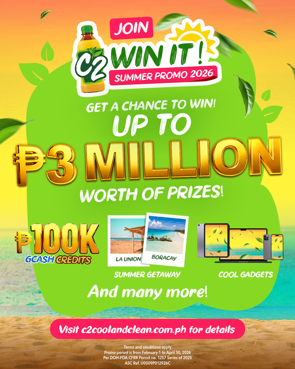 The C2 Win It: Summer Promo 2026 runs nationwide from February 1 to April 30, 2026. Participating SKUs include C2 335ml, 455ml, and 1L bottles with green caps. For full mechanics and updates, visit the official C2 Cool & Clean Facebook page or check out its website (www.c2coolandclean.com.ph).